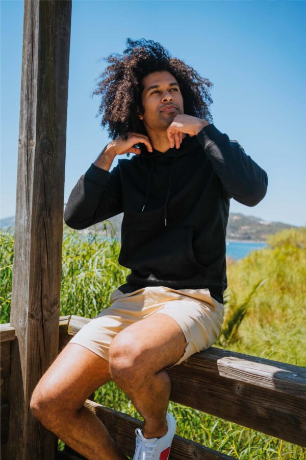 • Felpa americana cardada, 80% algodão com origem nas práticas de origem sustentável, 20% poliéster reciclado